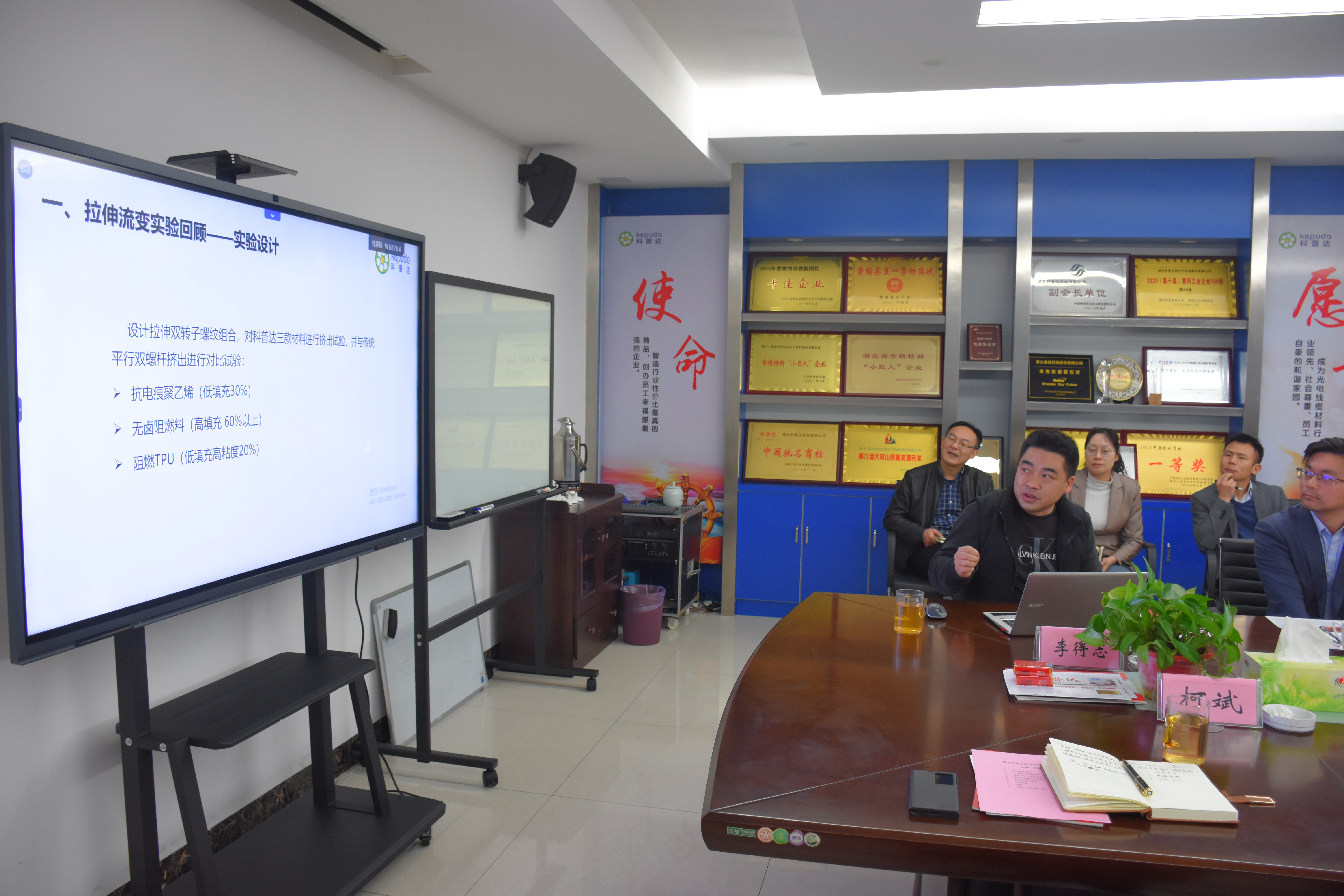 公司技術總工李得志匯報了前期與華南理工大學合作的拉伸流變技術的項目情況,在TPU彈性體加工上良好的表現,加工產品性能優異,但在高填充無鹵產品上面有待設備技術調整;并提出了相應的技術訴求,諸如密煉機轉子的改進、高填充材料的拉伸流變螺桿改進、自動上料系統的新方案等訴求。